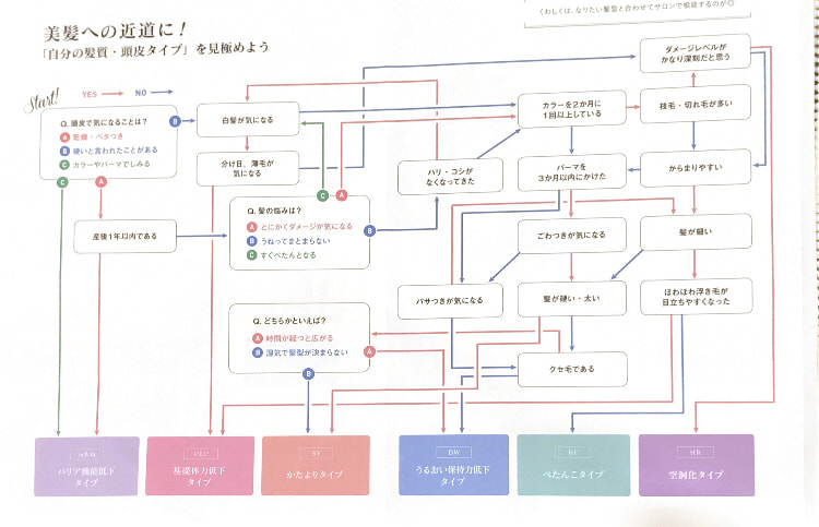 この6タイプを見て、2つ以上タイプが重なる方もいると思います。それは、バリア機能低下タイプと基礎体力低下タイプは頭皮に関連する症状。かたよりタイプとうるおい保持力低下タイプとぺたんこタイプと空洞化タイプは髪質の症状であるからです。